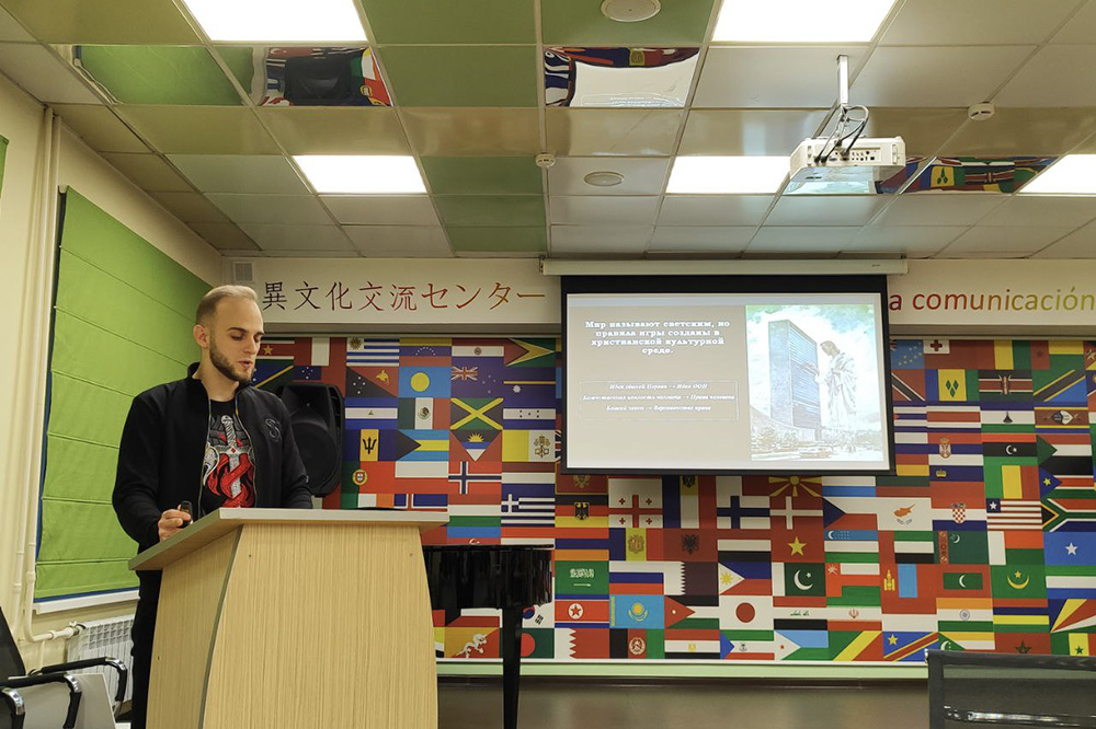 Магистрант ИМКиМО Денис Сальтевский выступил с докладом на тему «Влияние христианских конфессий на принятие решений в сфере международных отношений», сделав акцент на том, как проявляется роль мировой религии в современном диалоге стран и народов. Выступающий отметил сохраняющуюся высокую роль лидеров христианских церквей в решении современных политических и гуманитарных вопросов на международном уровне.