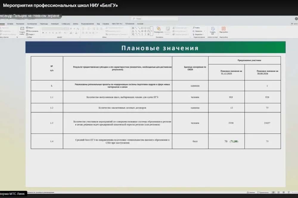 Открывая заседание, руководитель регионального проекта «Модернизация системы подготовки кадров в области химии и новых материалов с использованием гибких образовательных форматов и индустриального партнёрства», реализуемого на базе НИУ «БелГУ» Денис Белоцеркович отметил, что по итогам 2025 года все плановые показатели дорожной карты выполнены в полном объёме. Среди ключевых задач на 2026 год – обеспечение заключения 41 договора с индустриальными партнёрами. Достижение этого индикатора, по словам руководителя проекта, критически важно для кадрового суверенитета региона. В этой связи необходимо усилить разъяснительную работу среди абитуриентов и активизировать взаимодействие с предприятиями-заказчиками кадров.