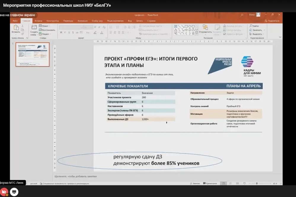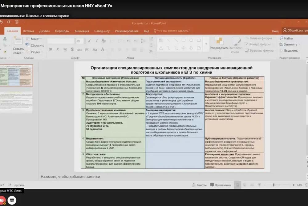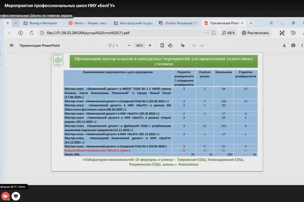 В рамках профориентационной работы доцент Людмила Дейнека рассказала о проекте «Химический десант», который позволил охватить мастер-классами более 300 школьников, а также о ежегодной конференции «Юность науки», объединившей 95 юных исследователей. Старший преподаватель Диана Марцева сообщила об успешной организации онлайн-занятий для подготовки к ЕГЭ, в которых участвуют 280 школьников области. Ассистент кафедры биологии Галина Шайдорова представила результаты создания учебно-методической базы, включая съёмку 15 лабораторных работ и передачу в школы специализированных «Химических боксов».