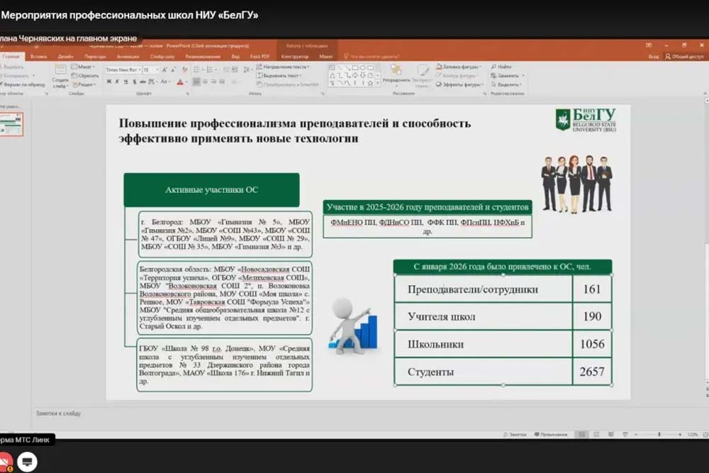 Руководитель Общественно-гуманитарной профессиональной школы Алевтина Новикова акцентировала внимание на роли гуманитарной составляющей в формировании кадрового потенциала проекта. За 2025 год и первый квартал 2026 года в рамках мероприятий школы привлечено более 20 тысяч человек, включая студентов, школьников, педагогов и представителей реального сектора экономики.