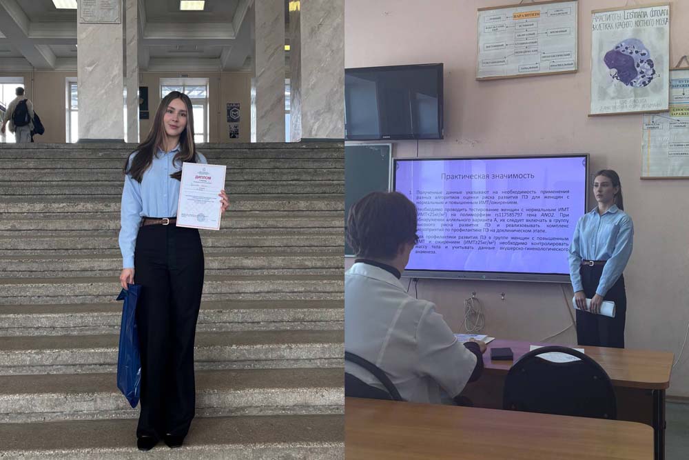 В Санкт-Петербурге на площадке ПСПбГМУ им. И.П. Павлова состоялась Всероссийская конференция с международным участием «Актуальные проблемы биомедицины-2026». В секции «Биология и генетика» с научным докладом выступила студентка 4 курса специальности «Лечебное дело» Мария Чурносова. Девушка рассказала о некоторых клинико-анамнестических и генетических характеристиках беременных с преэклампсией.